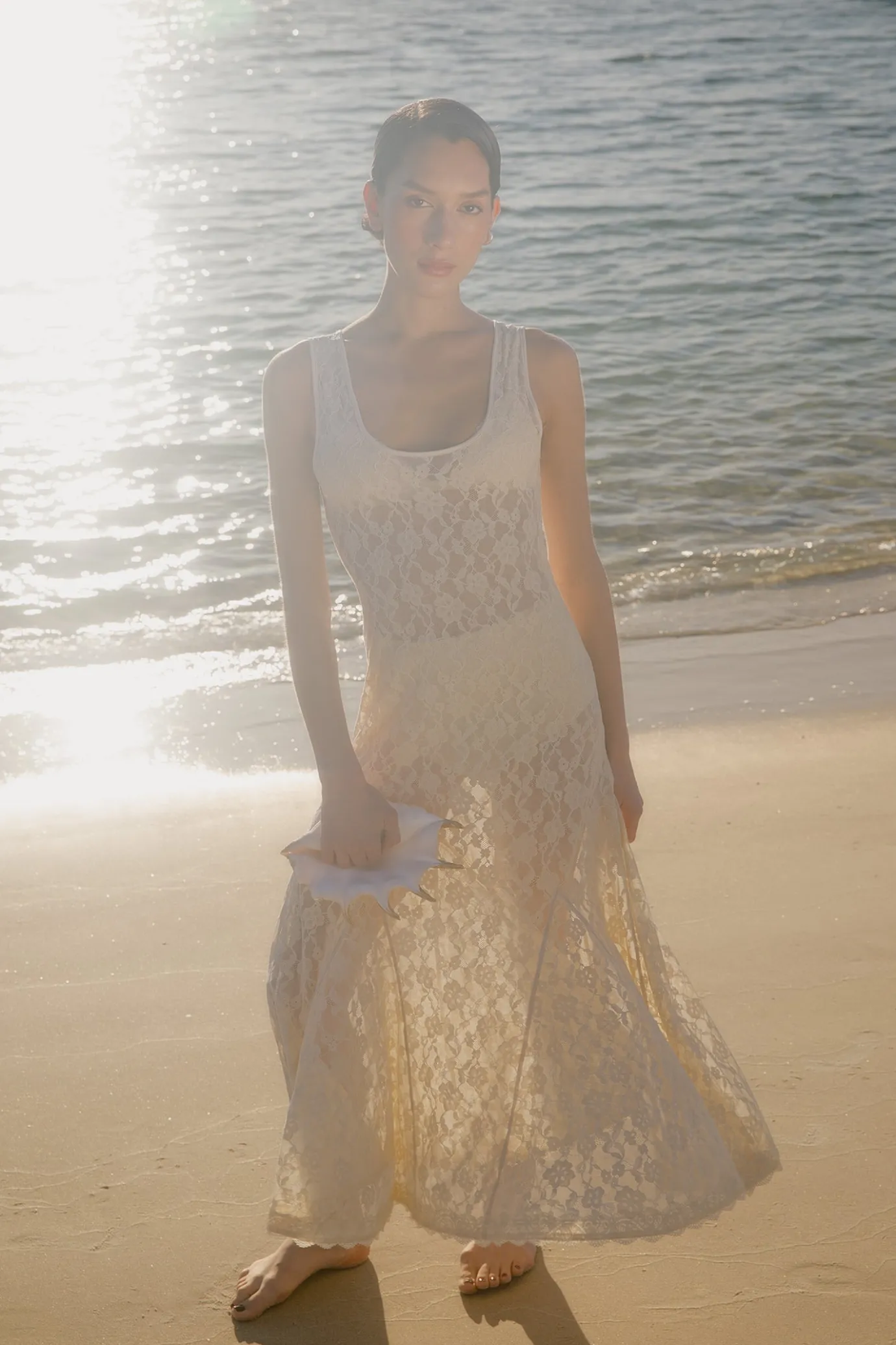 Longline Midi Length DressSemi Sheer LaceMatching Lace Bralette And High Waisted Knickers V Neckline On Front And Scoope…