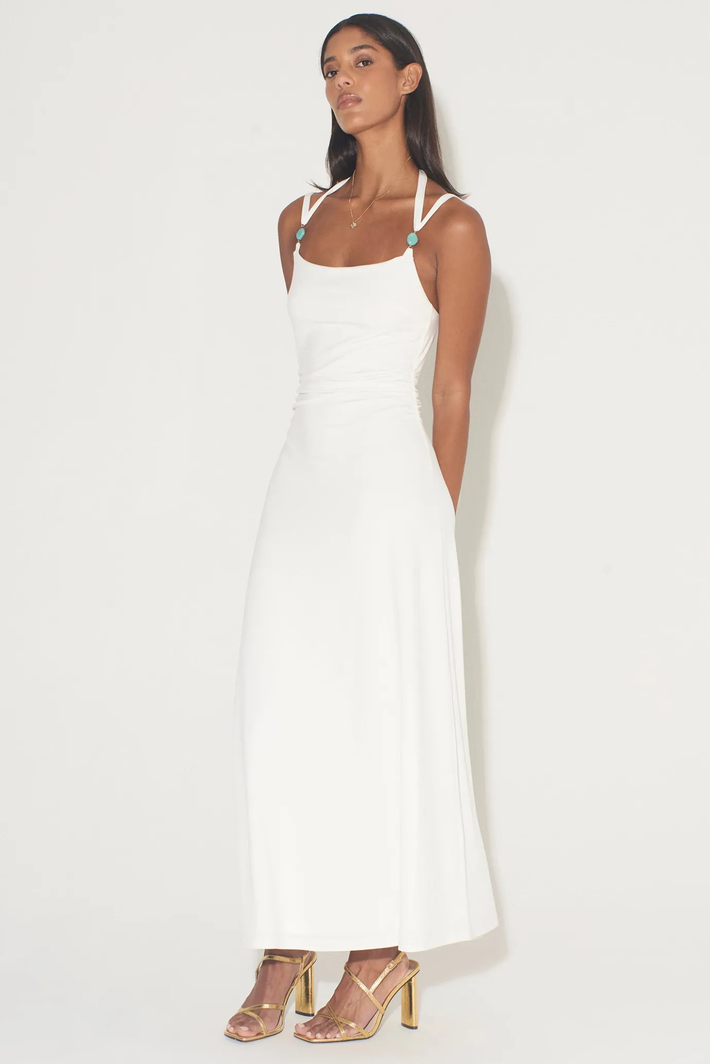 Fit And FlareFully LinedStatement BeadsBead Tie EndsHalter Tie And Shoulder Strap CombindationSquare NecklineLow Scoop B…