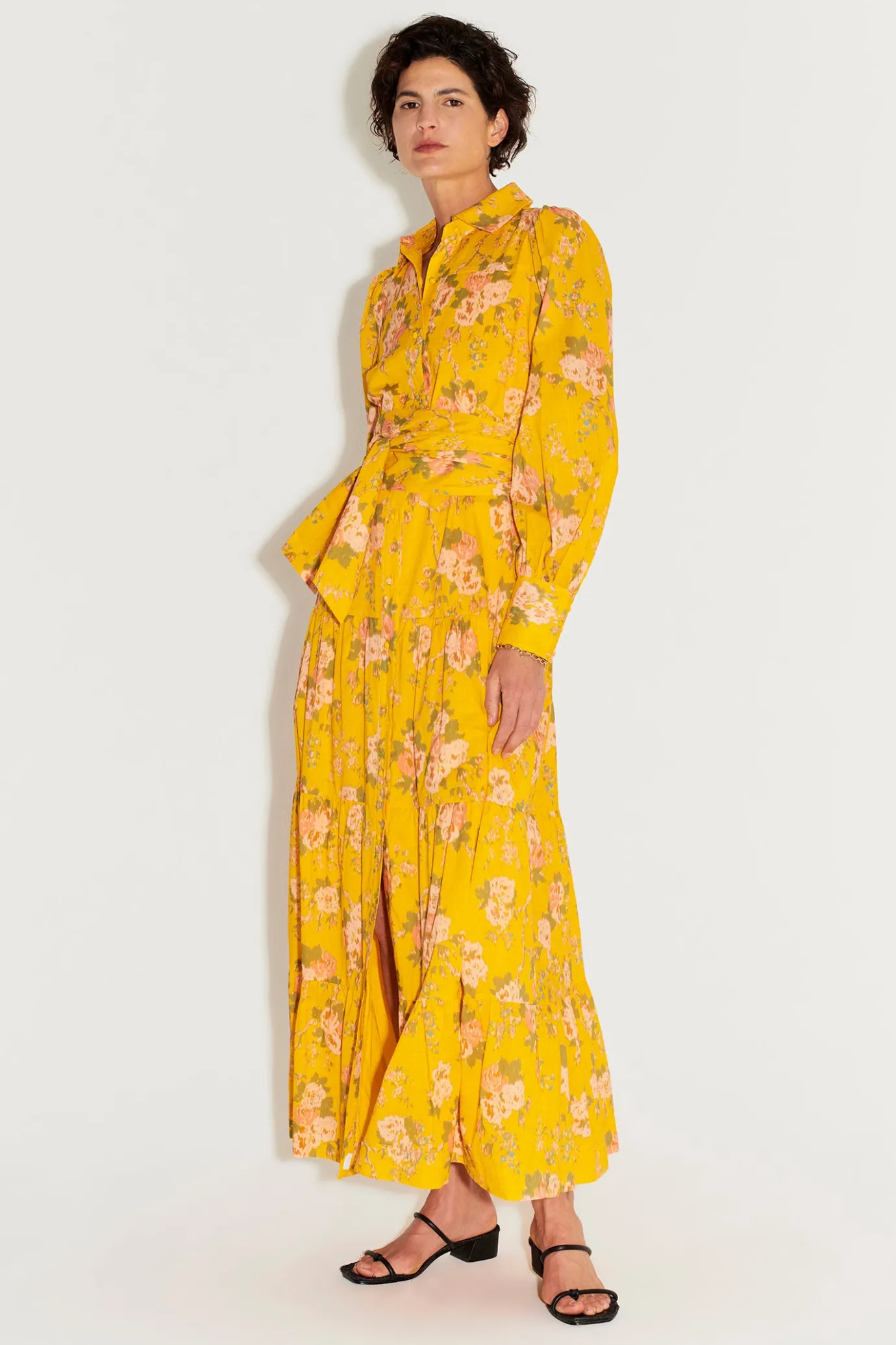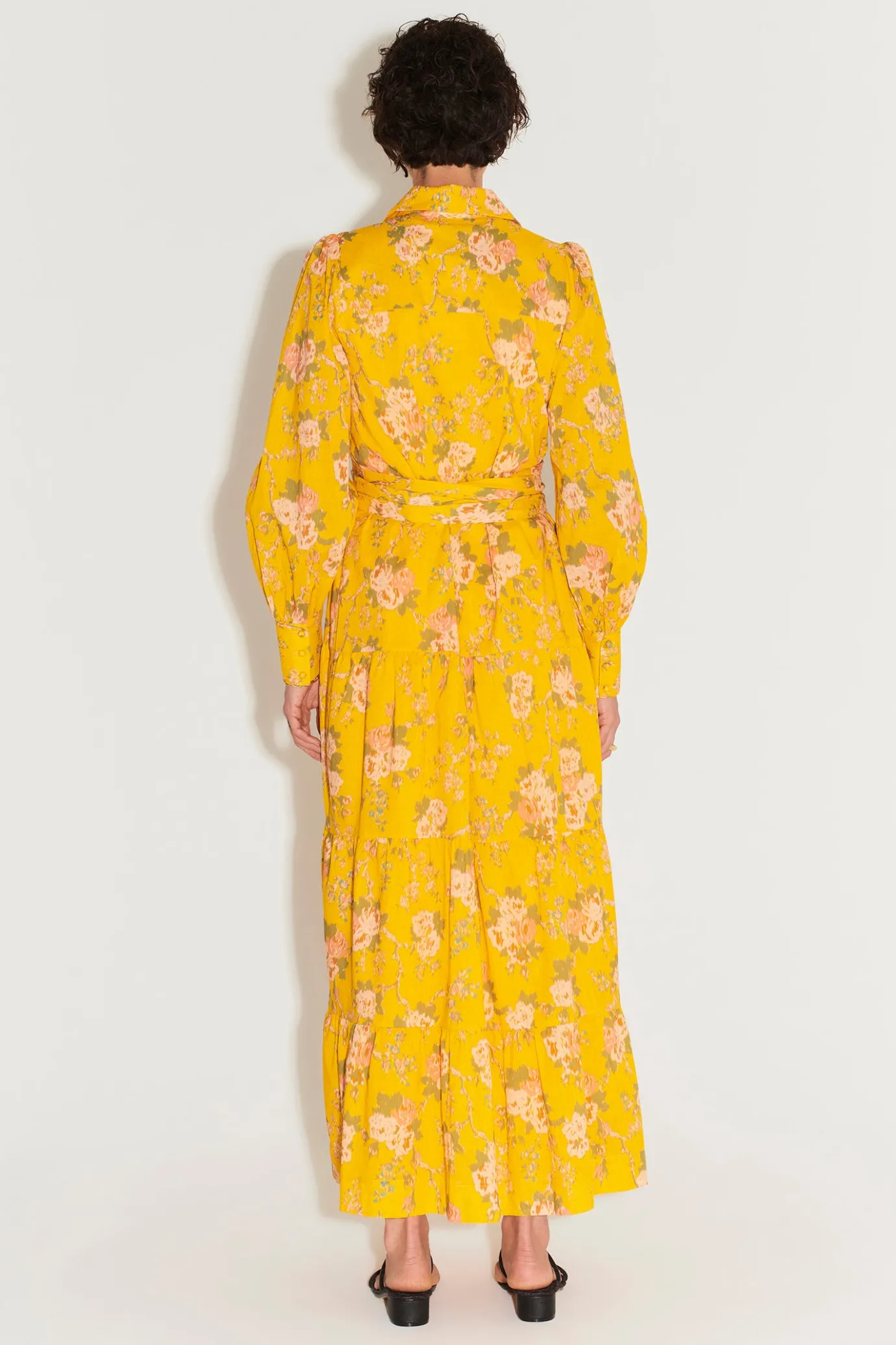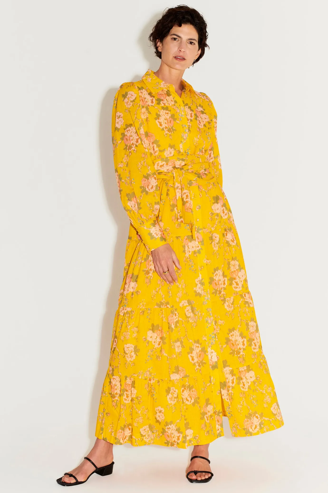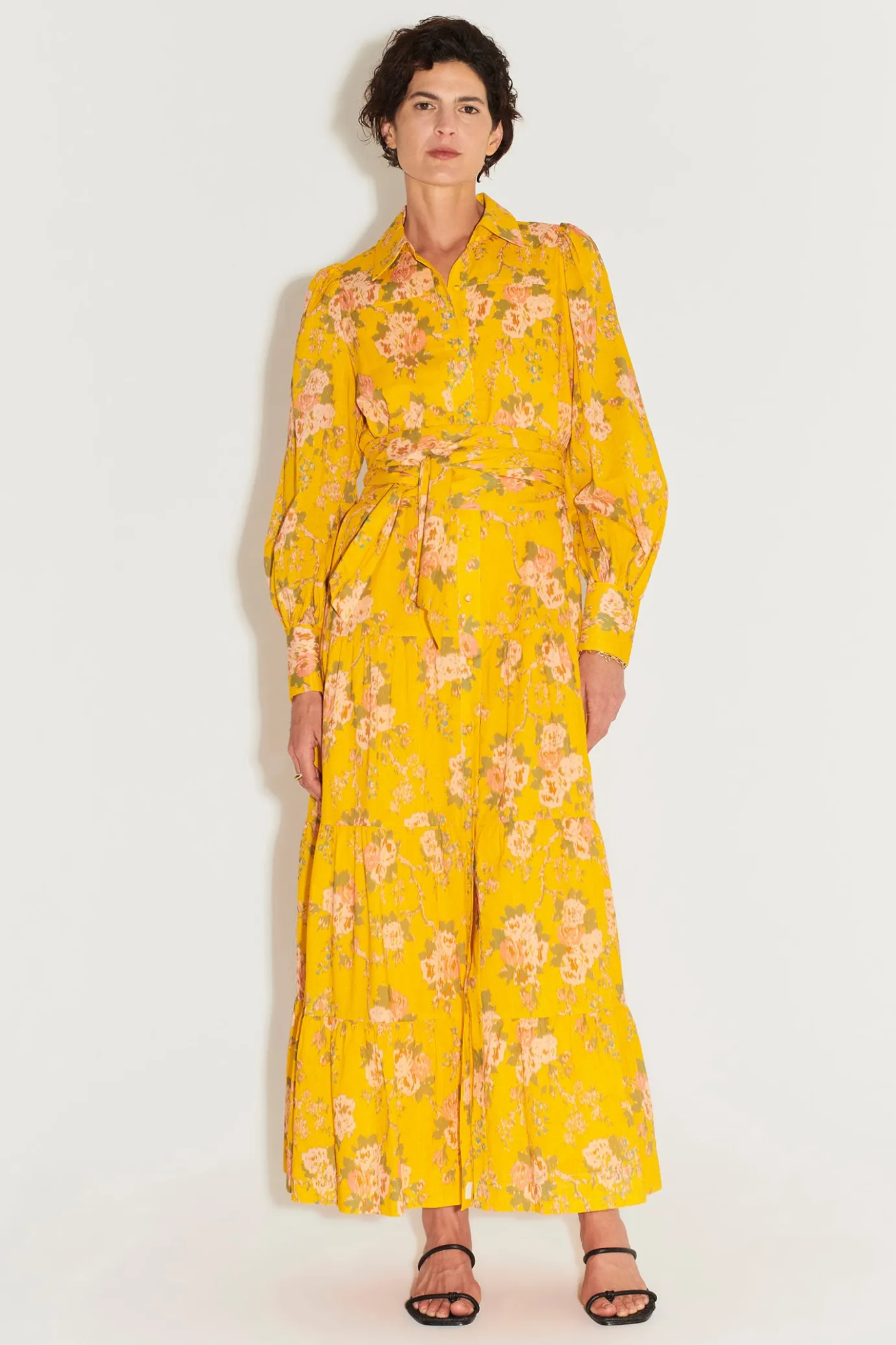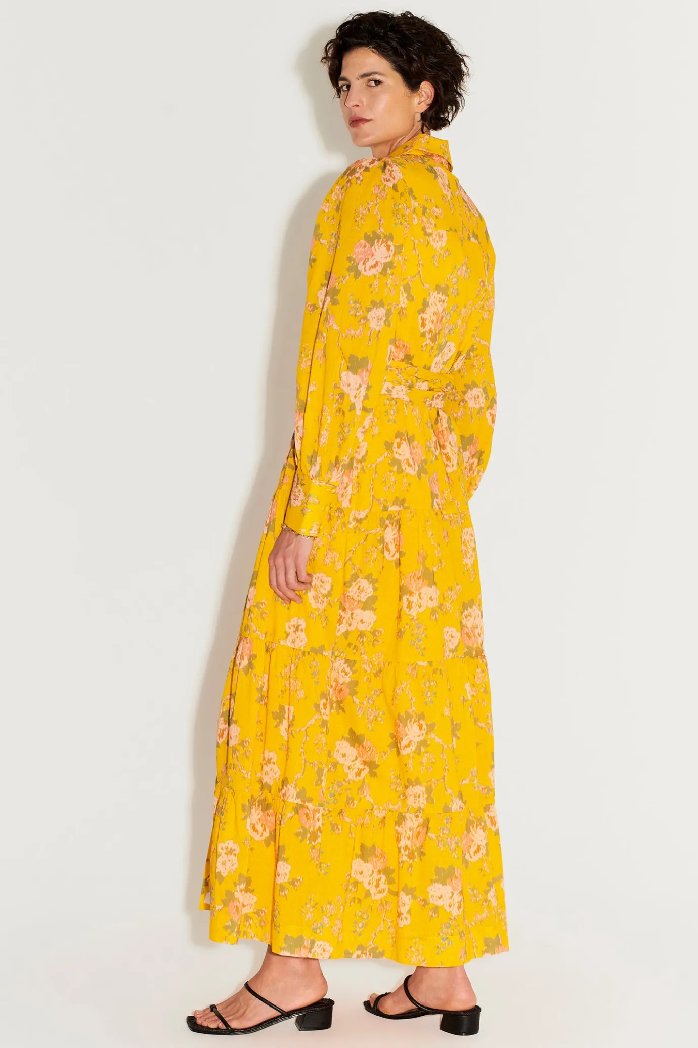 Relaxed FitLined BodyTiered Maxi DressClassic Shirting CollarButton Down FrontBillowing Long Sleeves With Shirting CuffH…