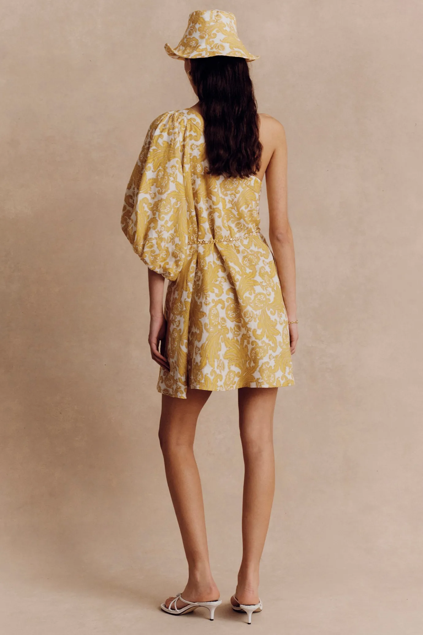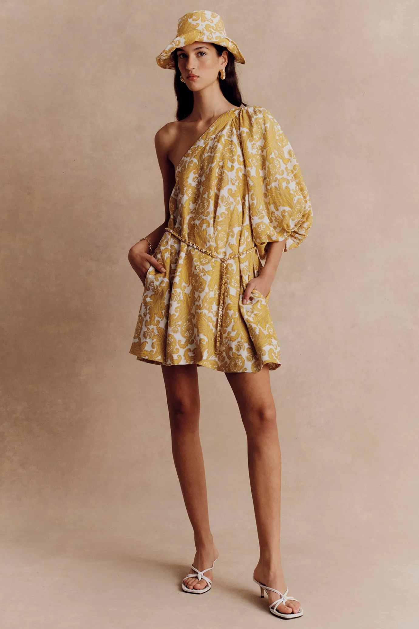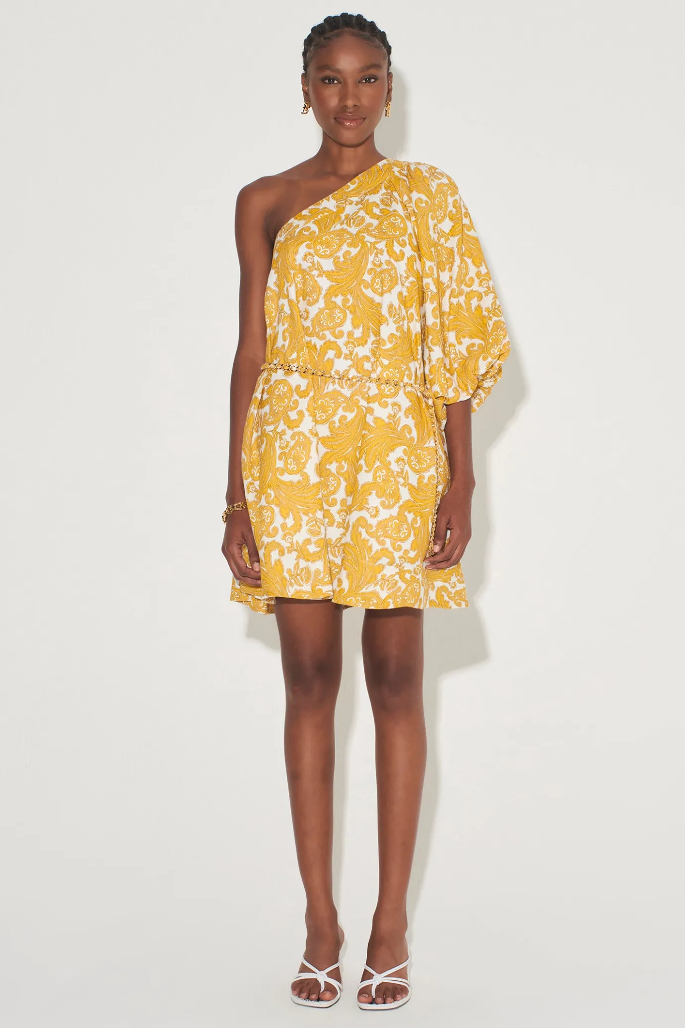 Asymmetrical Swing Mini DressFully LinedOne Shoulder With Puff SleeveInvisible Zip ClosureLinen Woven Chain BeltSide Sea…