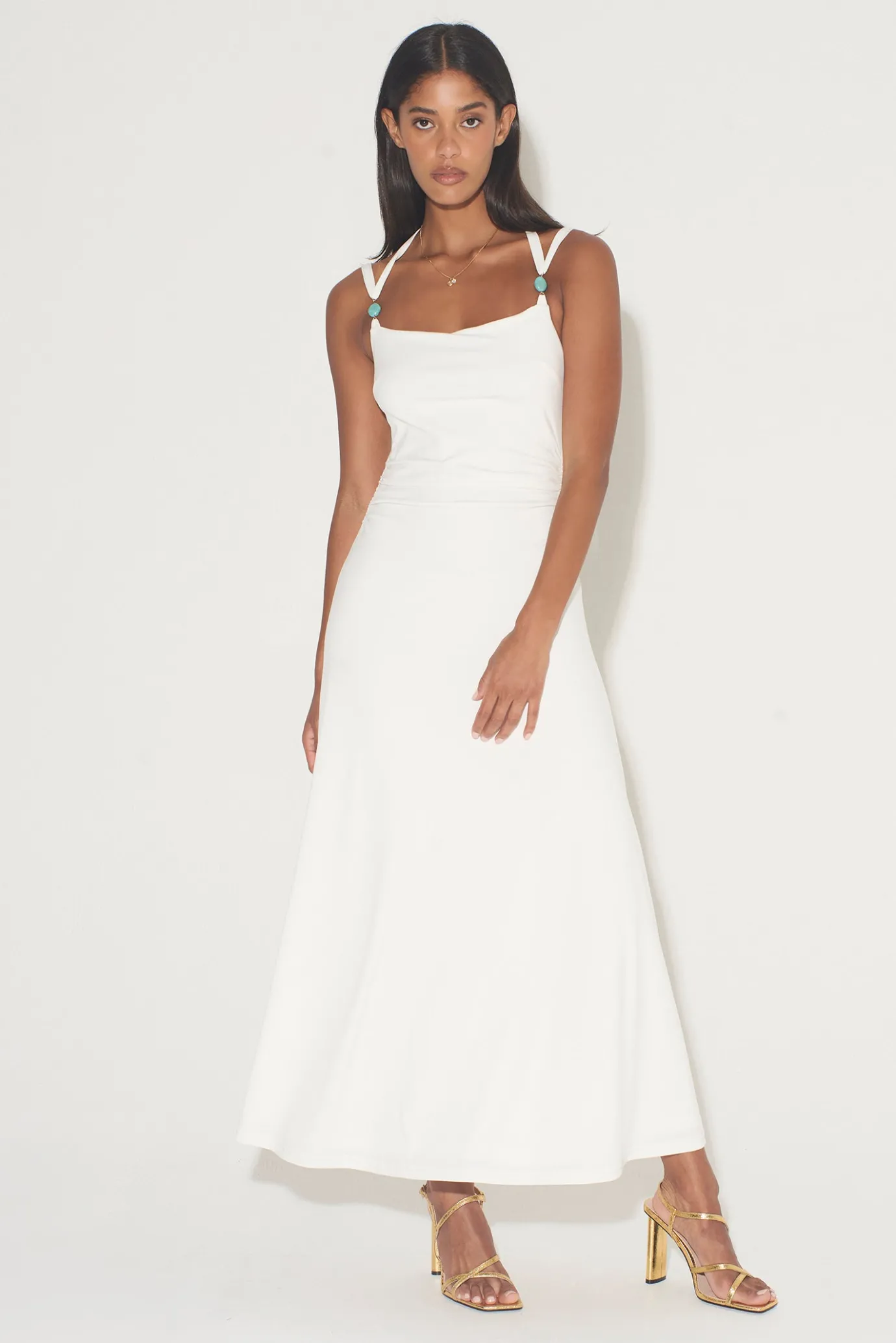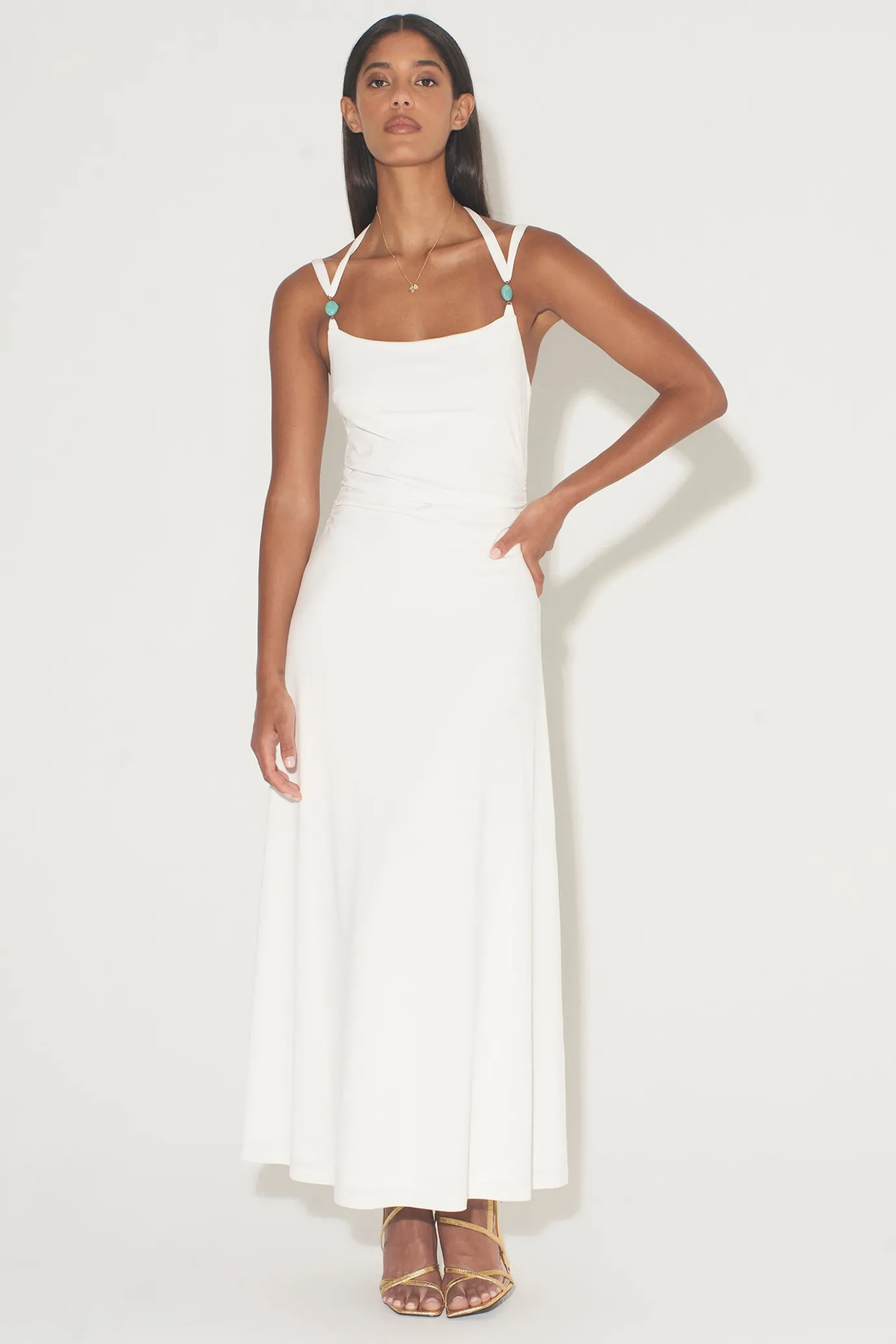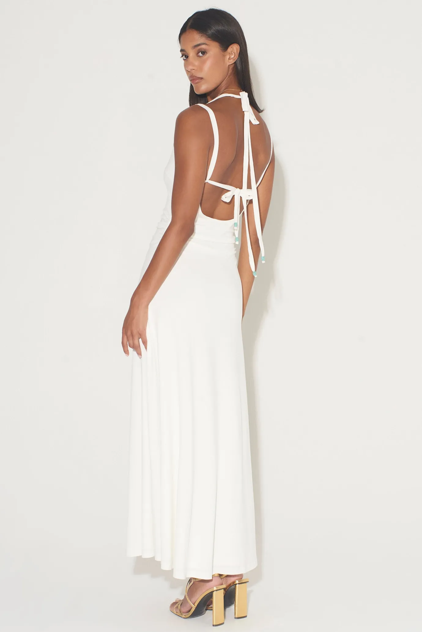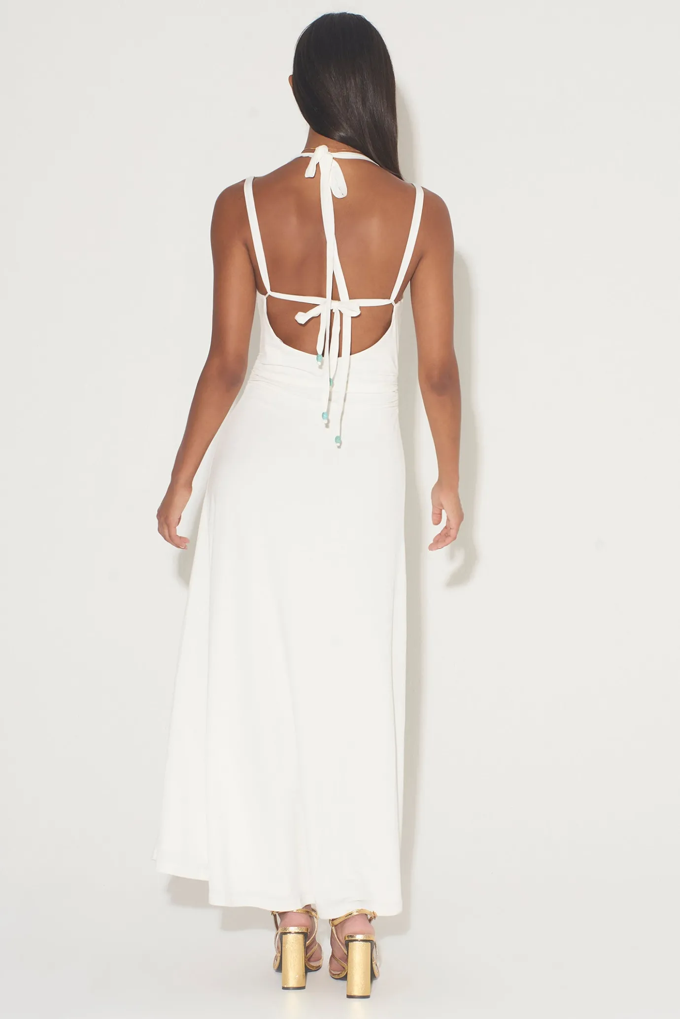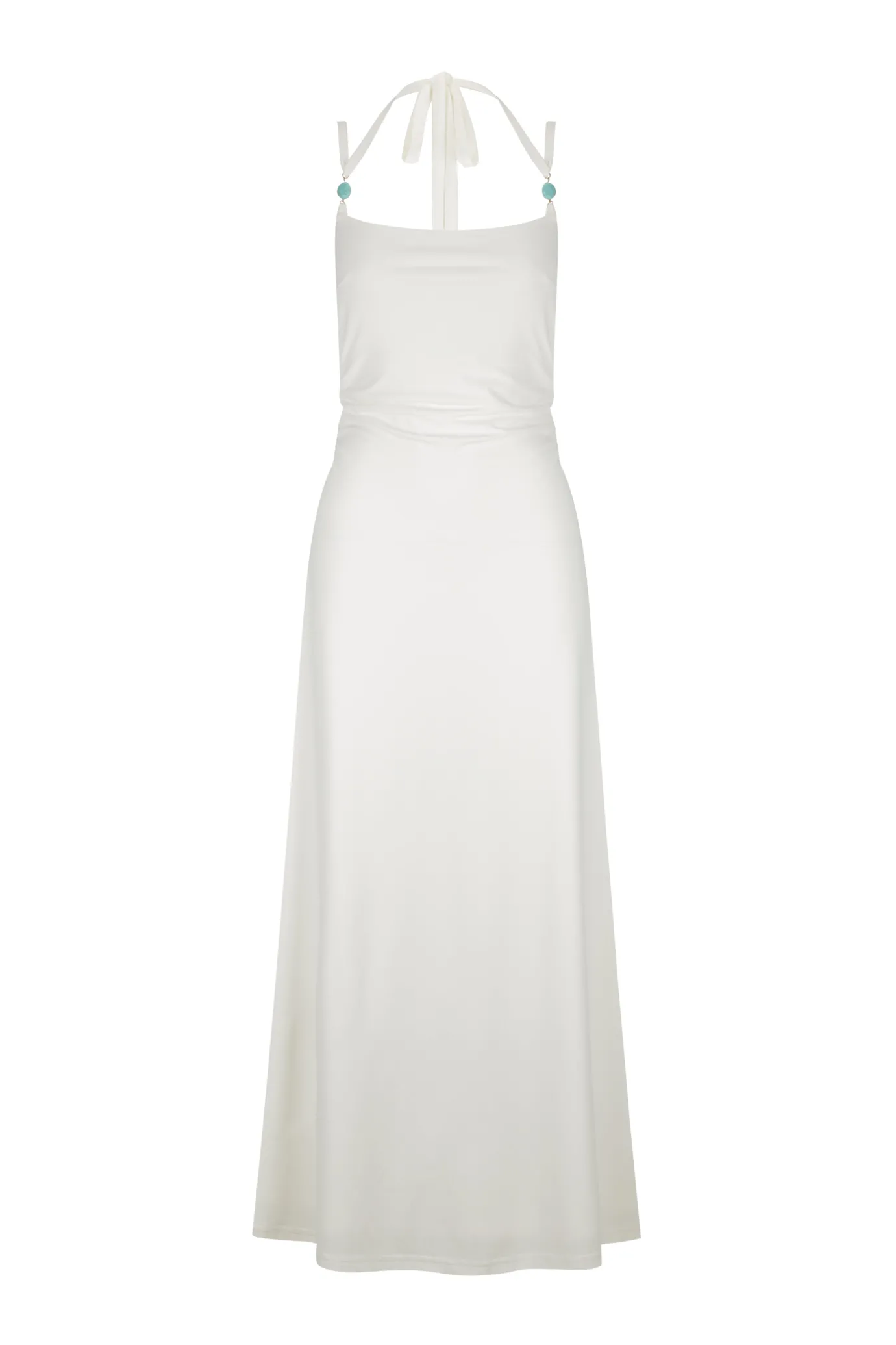 Fit And FlareFully LinedStatement BeadsBead Tie EndsHalter Tie And Shoulder Strap CombindationSquare NecklineLow Scoop B…